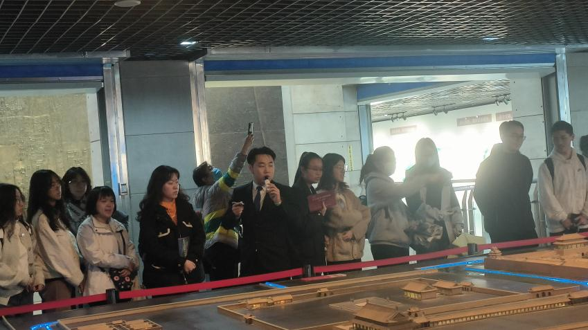 随后,同学们返回展览馆一层跟随讲解员进行了更加细致的参观学习。讲解员首先通过对“北京湾”青铜模型的展示形象地向同学们说明了北京城区的地理位置。北京作为“大道分途之地”,汇聚了西北游牧文化、东南农耕文明和东北森林文化。同时,得益于自身深厚的文化积淀和便利的交通条件,从蓟丘到周末的燕都,从唐代的幽州城到辽代的燕京,从金中都到元大都到北平、北京,北京成为了八朝古都,在中国历史上成为了一个特殊的历史符号,占据了特别的战略地位。