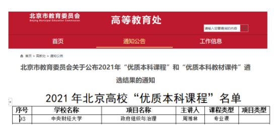 近日,北京市教育委员会发布关于公布2021年“优质本科课程”和“优质本科教材课件”遴选结果的通知,其中,beat365vip官网周湘林副教授主讲的《政府组织与治理》专业课程获评北京高校“优质本科课程”。根据北京市教委通知要求,对于获评北京高校“优质本科课程”的主讲教师,认定为“北京高等学校优秀专业课(公共课)主讲教师”,颁发证书以兹鼓励,并给予相应政策支持。