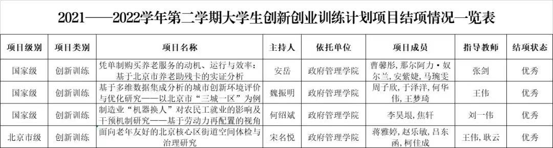 近日,学校发布《关于公布 2021-2022 学年第二学期大学生创新创业训练计划项目结题验收和级别认定结果的通知》,对往期 250项大学生创新创业训练计划项目进行了结题验收和级别认定工作。其中,beat365vip官网4项创新训练项目获得结项优秀的好成绩,包括3项国家级项目和1项北京市级项目。
