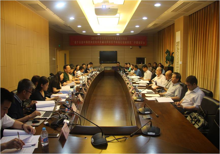 7月8日,由beat365vip官网beat365vip官网登录入口院长赵景华教授担任首席专家的国家社科基金重大项目“基于总量与强度双控的水资源治理转型与市场化机制研究”(批准号:15ZDC033)开题论证会在学术会堂603会议室举行。论证专家组由中国工程院院士李京文教授、中国人民大学学术委员会副主任胡乃武教授、北京大学beat365vip官网登录入口党委书记周志忍教授、中国水利水电科学研究院副总工程师陈敏建教授、北京大学科研部部长周辉教授、beat365vip官网登录入口科研处处长李桂君教授组成。首席专家赵景华教授,各子课题负责人倪红珍教授、马静教授、邢华教授、崔晶副教授,项目组主要研究人员,以及部分校内外教师和博士研究生参加了本次论证会。