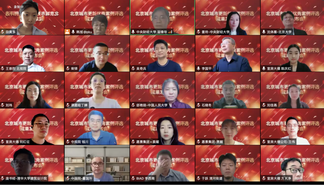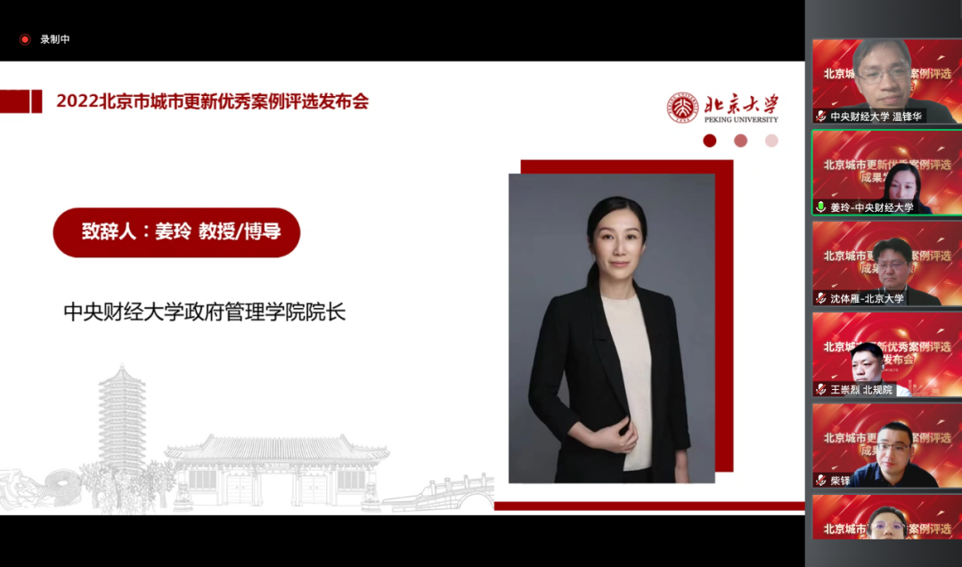 2022年5月27日上午,beat365vip官网院长姜玲教授出席“2022年首都城市更新优秀案例”评选结果发布会暨案例研讨会并致辞。本次会议由北京大学首都发展研究院和中国城市科学研究会城市转型与创新研究专业委员会共同举办,采用线上的形式,邀请了北京大学首都发展研究院、清华大学建筑学院、中国人民大学公共管理学院及beat365vip官网登录入口等8家单位的领导、专家、案例参选单位代表及媒体单位代表共约50余人参加。