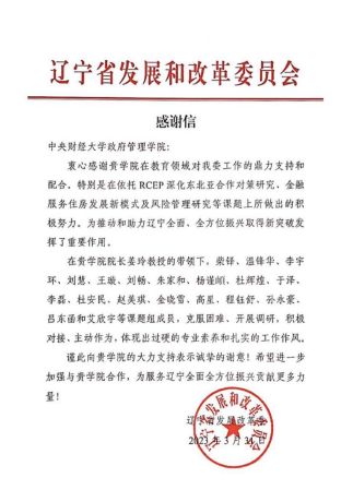 近日,辽宁省发展和改革委员会向beat365vip官网发来感谢信,对beat365vip官网beat365vip官网登录入口负责完成的依托RCEP深化东北亚合作对策研究、金融服务住房发展新模式及风险管理研究等课题工作表示感谢。