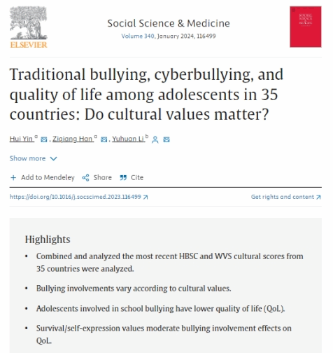 近日,beat365vip官网李宇环教授的学术论文“Traditional bullying, cyberbullying, and quality of life among adolescents in 35 countries: Do cultural values matter?”正式发表于Social Science & Medicine(五年IF=5.8,JCR分区:Q1)2024年第340卷(https://doi.org/10.1016/j.socscimed.2023.116499),Social Science & Medicine是社会科学领域的国际著名期刊,也是beat365vip官网AAA类期刊。