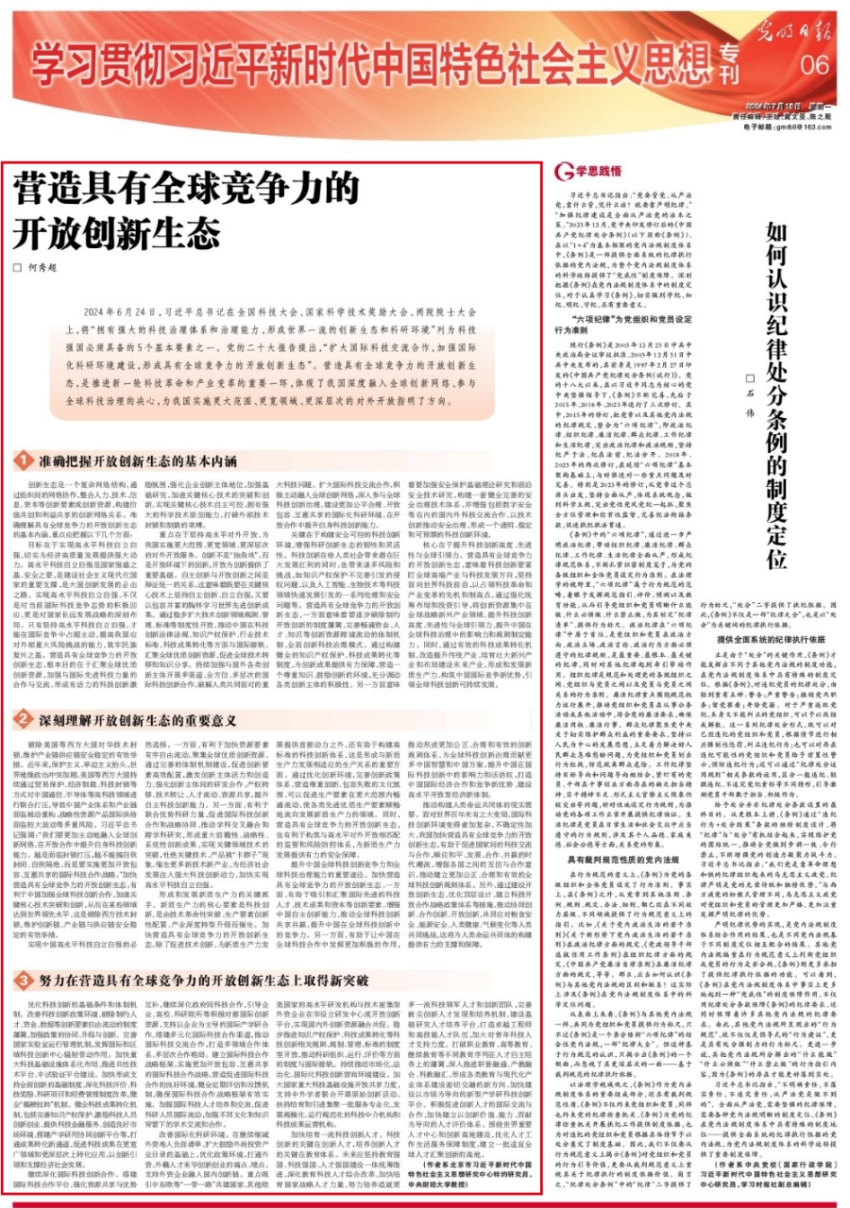 7月15日,《光明日报》刊登beat365vip官网教授何秀超(北京市习近平新时代中国特色社会主义思想研究中心特约研究员)署名文章《营造具有全球竞争力的开放创新生态》。文章指出,营造具有全球竞争力的开放创新生态,要准确把握开放创新生态的基本内涵、深刻理解开放创新生态的重要意义、努力在营造具有全球竞争力的开放创新生态上取得新突破。