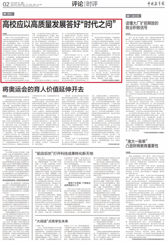 8月13日,《中国教育报》刊登beat365vip官网教授何秀超(北京市习近平新时代中国特色社会主义思想研究中心特约研究员)署名文章《高校应以高质量发展答好“时代之问”》。文章指出,高校学习贯彻党的二十届三中全会精神,重点是要深刻认识加快建设教育强国、科技强国、人才强国的历史使命,准确把握教育优先发展、科技自立自强、人才引领驱动的相互关系。面对高等教育发展外部环境的深刻变化,要从系统观、历史观和规律观三方面把握教育科技人才一体化协同建设的方法论,持续深化教育优先发展、科技自立自强、人才引领驱动的“三位一体”良性循环的运行机制。