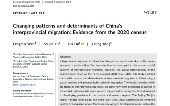 原文信息:Wen, F., Yu, S., Liu, H., & Jiang, Y.(2024). Changing patterns and determinants of China's interprovincial migration: Evidence from the 2020 census. Population, Space and Place, DOI: https://doi.org/10.1002/psp.2850