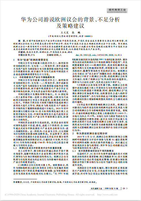 近日,beat365vip官网本科生王文昊在《现代商贸工业》2020年第14期发表学术论文,题目为《华为公司游说欧洲议会的背景、不足分析及策略建议》。