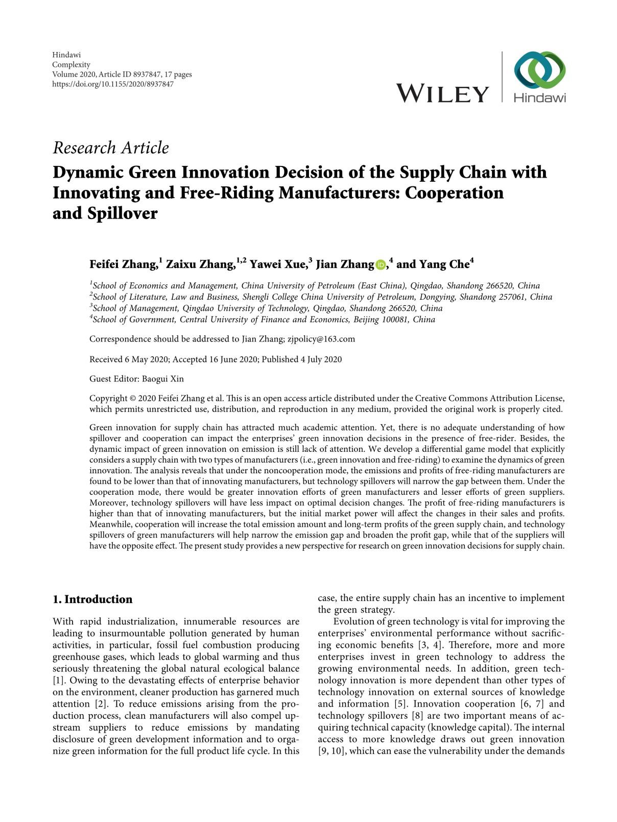 近日,beat365vip官网本科生车洋作为共同作者在SCI期刊Complexity(JCR Q1期刊)发表学术论文,题目为“Dynamic Green Innovation Decision of the Supply Chain with Innovating and Free-Riding Manufacturers: Cooperation and Spillover”。该论文分析了在“搭便车”企业存在的情况下,创新溢出效应和合作效应会如何影响企业的绿色创新决策,为绿色技术创新政策设计与企业决策研究提供了新的视角。