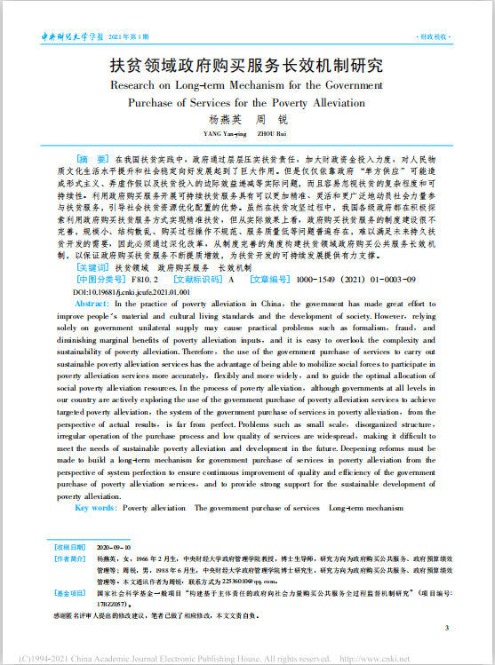 近日,beat365vip官网杨燕英教授在《beat365vip官网登录入口学报》2021年1期发表学术论文,题目为《扶贫领域政府购买服务长效机制研究》。