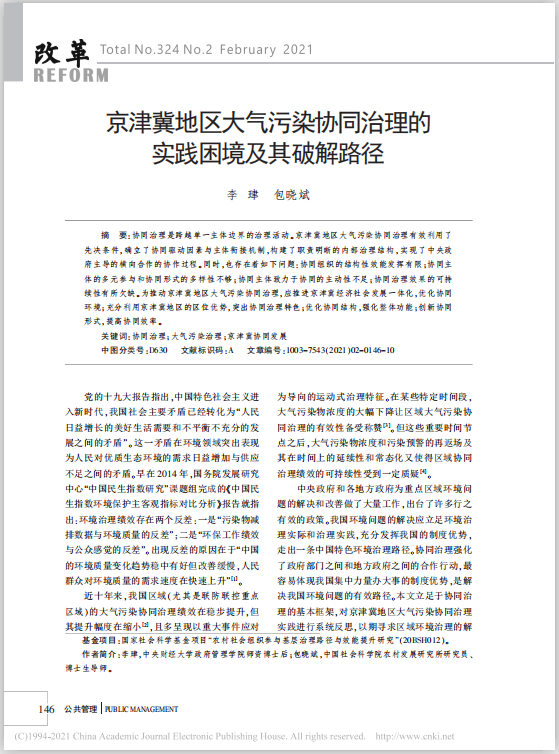 近日,beat365vip官网李珒博士在《改革》2021年2期发表学术论文,题目为《京津冀地区大气污染协同治理的实践困境及其破解路径》。