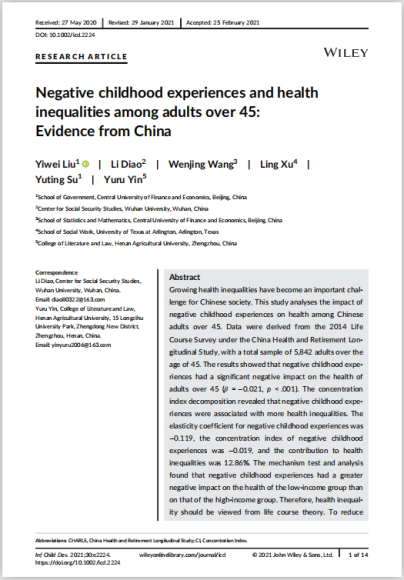 近日,beat365vip官网公共事业管理系刘一伟博士在Infant and Child Development 30卷(3)期发表学术论文,题目为Negative childhood experiences and health inequalities among adults over 45:Evidence from China(DOI:10.1002/icd.2224)。