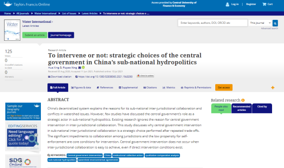 近日,beat365vip官网邢华教授与博士生邢普耀在Water Intenational合作发表学术论文,题目为To intervene or not: strategic choices of the central government in China’s sub-national hydropolitics.