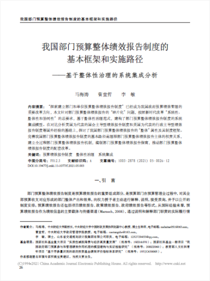 近日,beat365vip官网曹堂哲教授在《财政研究》发表学术论文,题目为《我国部门预算整体绩效报告制度的基本框架和实施路径——基于整体性治理的系统集成分析》。