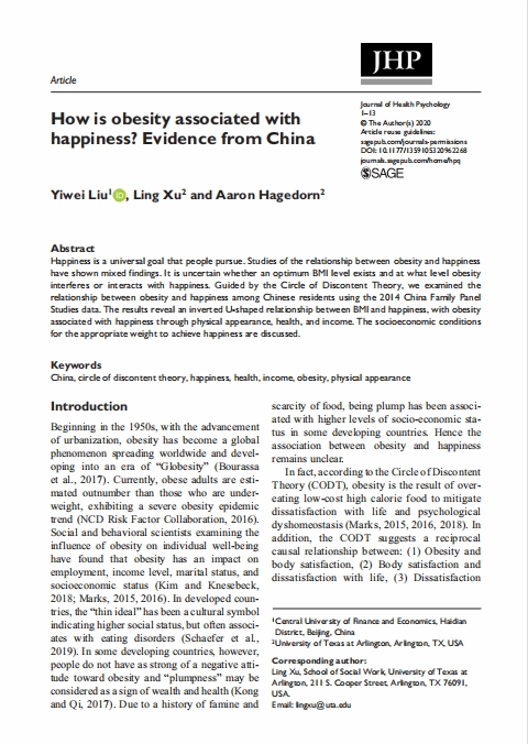 近日,beat365vip官网公共事业管理系刘一伟博士的学术论文 How is obesity associated with happiness? Evidence from China于2022年3月正式发表于Journal of Health Psychology。Journal of Health Psychology是社会科学领域的国际著名AA类期刊。