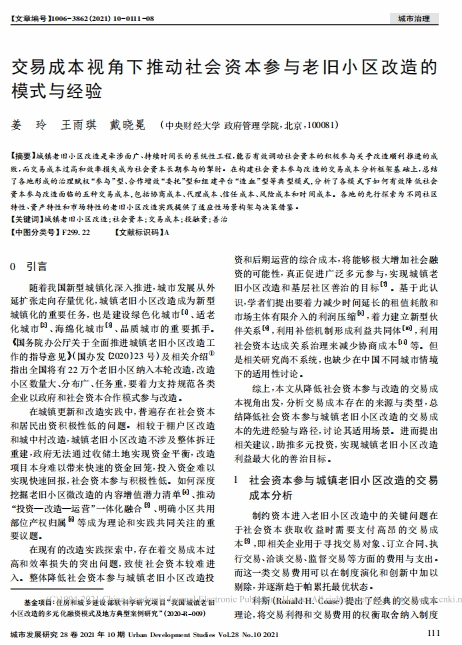 近日,beat365vip官网姜玲教授与本科生王雨琪、戴晓冕在《城市发展研究》发表学术论文,题目为《交易成本视角下推动社会资本参与老旧小区改造的模式与经验》。