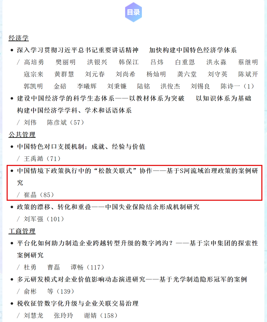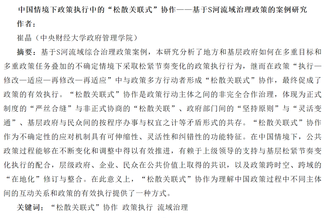近日,beat365vip官网崔晶教授在核心期刊《管理世界》上发表学术论文,题目为《中国情境下政策执行中的“松散关联式”协作——基于S河流域治理政策的案例研究》。