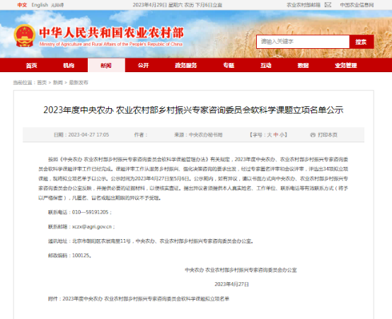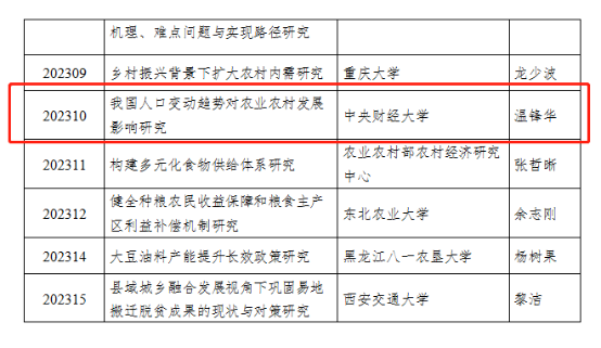 近日,中央农办、农业农村部乡村振兴专家咨询委员会2023年度软科学课题评审完成,经过专家匿名评审和会议评审,评选出34项拟立项课题。beat365vip官网温锋华副教授申报的课题《我国人口变动趋势对农业农村发展影响研究》获得立项。该课题围绕乡村振兴战略的总体目标,在科学研判我国中长期人口规模、结构和迁移变化趋势基础上,全面分析人口变动对保障粮食安全、开展乡村建设、完善乡村治理等领域的中长期影响,提出前瞻性应对思路和政策建议。