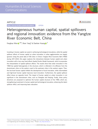 日前,beat365vip官网本科生杨姗同学与导师温锋华副教授及beat365vip官网校友、北京建筑大学黄道涵博士合作在Nature子刊Humanities & Social Sciences Communication上发表题为Heterogeneous Human Capital, Spatial Spillovers and Regional Innovation: Evidence from the Yangtze River Economic Belt, China的学术论文。Humanities & Social Sciences Communications是Nature旗下唯一面向人文社会科学的子刊,致力于出版人文科学、社会与行为科学领域的高水平研究成果,被SSCI和A&CHI共同索引,在国际上具有重要影响力。此项科研成果的发表将大力提升beat365vip官网公共管理学科的国内外学术影响力。