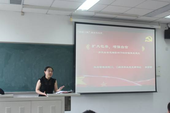 本次会议,李莎莉同志进行了题为“扩大包容,增强自信”的讲座,在讲座中,她指出了当代大学生党员坚定党员信仰,抵制各种错误思想腐化的重要性。讲座在一个介绍2011年“阿拉伯之春”的视频中开始,从而引出本次讲座的主题——“多元社会思想影响下的价值体系建立”。接着,李莎莉同志以福特基金会等资助中国学者进行科研项目的数据,向与会的各位同志介绍了当今多元文化下的“新自由主义”、“极端个人主义”、“历史虚无主义”等思潮的冲击。