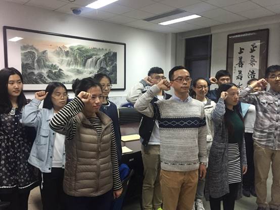 本次活动分为两个环节。首先是朱洁带领各位党员重新宣读入党誓词。“我志愿加入中国共产党,拥护党的纲领,遵守党的章程……”。在庄严肃穆的氛围中,鲜红的党旗下响起了铿锵有力的誓言。对入党誓词的重温使在场的每一位党员再一次接受心灵的洗礼,重温了自己的入党动机,进一步坚定了自身立场和信念。