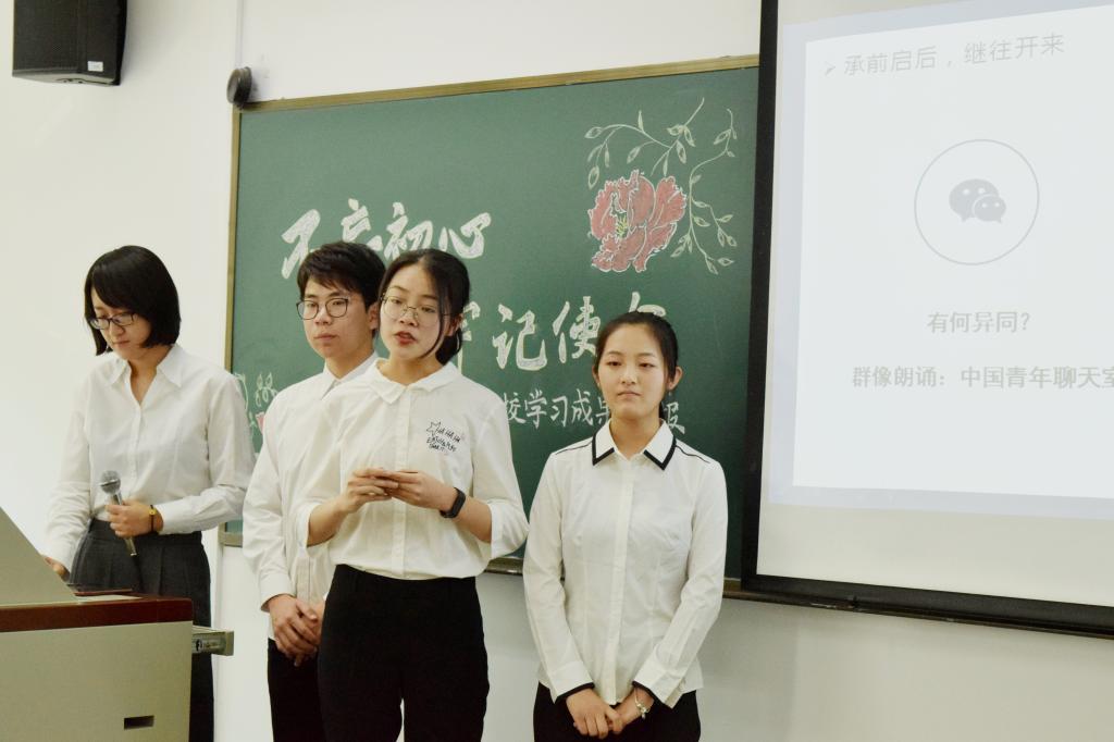 志气峥嵘,可担乾坤,勇担时代责任,不忘历史使命,“追梦赤子心”小组沿着历史逐梦而来,看一代代青年的历史使命如何随时代变迁而不断变化。从1919到2019,青年从国家最初的启蒙者一路成长为国家的建设者、改革者,最终成长为如今国家的创新者,他们以自身的开拓进取赋予国家生生不息的活力。在随后的群像朗诵中,“追梦赤子心”小组通过“中国青年聊天室”的新颖形式发出不同年代的青年之声,跨时空的对话呈现的是不变的使命情怀