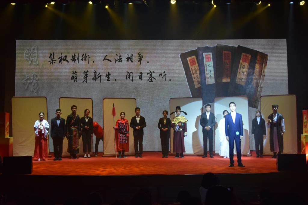 来自会计学院的非鱼团队带来《同袍华夏,我在处为家》。泱泱华夏五千年,是栉风沐雨,更是骄傲辉煌。听,那编钟声传递着千年的追思;看,那七雄称霸、贞观之治、诗词歌赋闪耀着历史的光芒。“岂曰无衣,与子同袍”,他们在一句句诗词歌赋的交错吟诵间不断发问与思考,在五千年的光阴里轮换追寻,在时代号召下发出青年之声。层层迭进,安排巧妙,将千年的风霜傲骨娓娓道来。