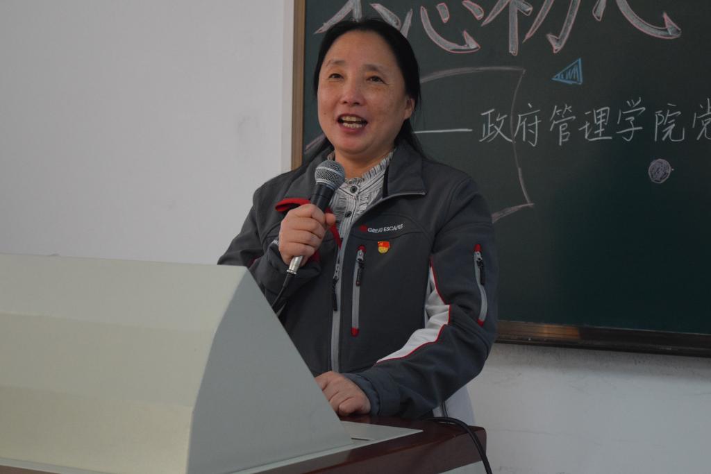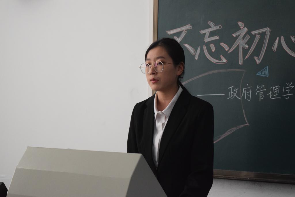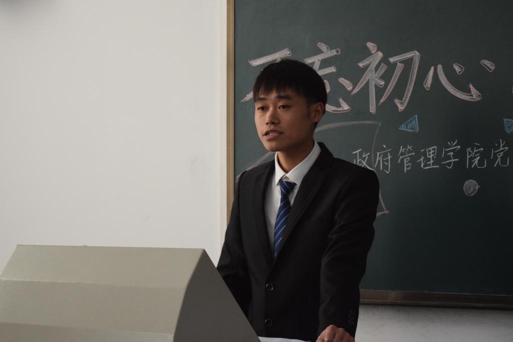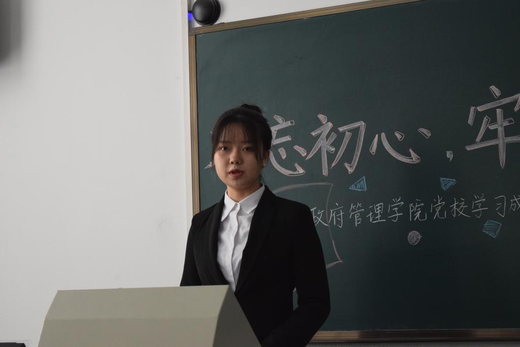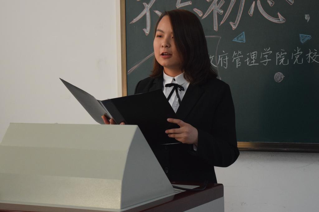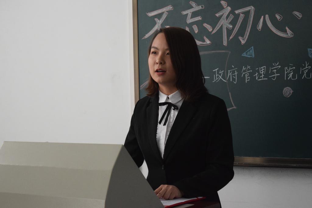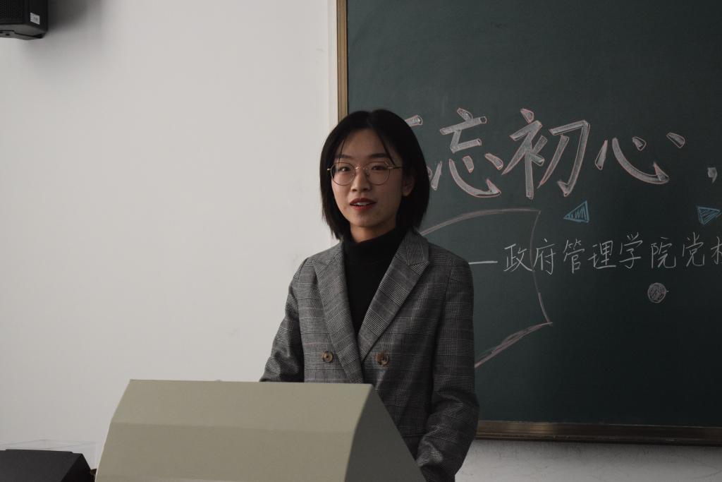 随后,入党积极分子学生代表付禛婧同学上台发言。回忆自己的学习经历,付禛婧感慨中国共产党一路走来充满挑战与艰辛,但共产党人永远坚守内心,始终保持战斗姿态。时代的接力棒已经交到青年人手上,我们生逢盛世,应有信心和能力去实现中华民族伟大复兴。作为中财政管人,作为入党积极分子,共产党的接班人,我们要秉上善若水之志,乘正气浩然之德,保持为中华之崛起而读书的治学初心,胸怀天下格局,关心国家未来,担责任、敢作为、做实事。付禛婧愿同大家一起继续上下求索、秉持初心,成为一名合格的共产党人。