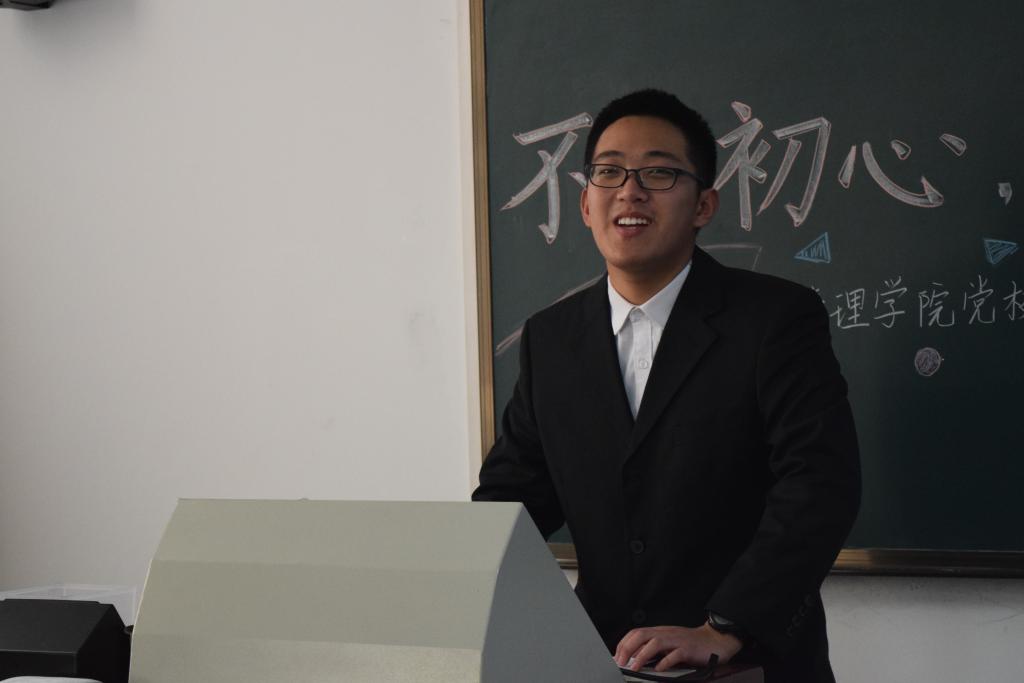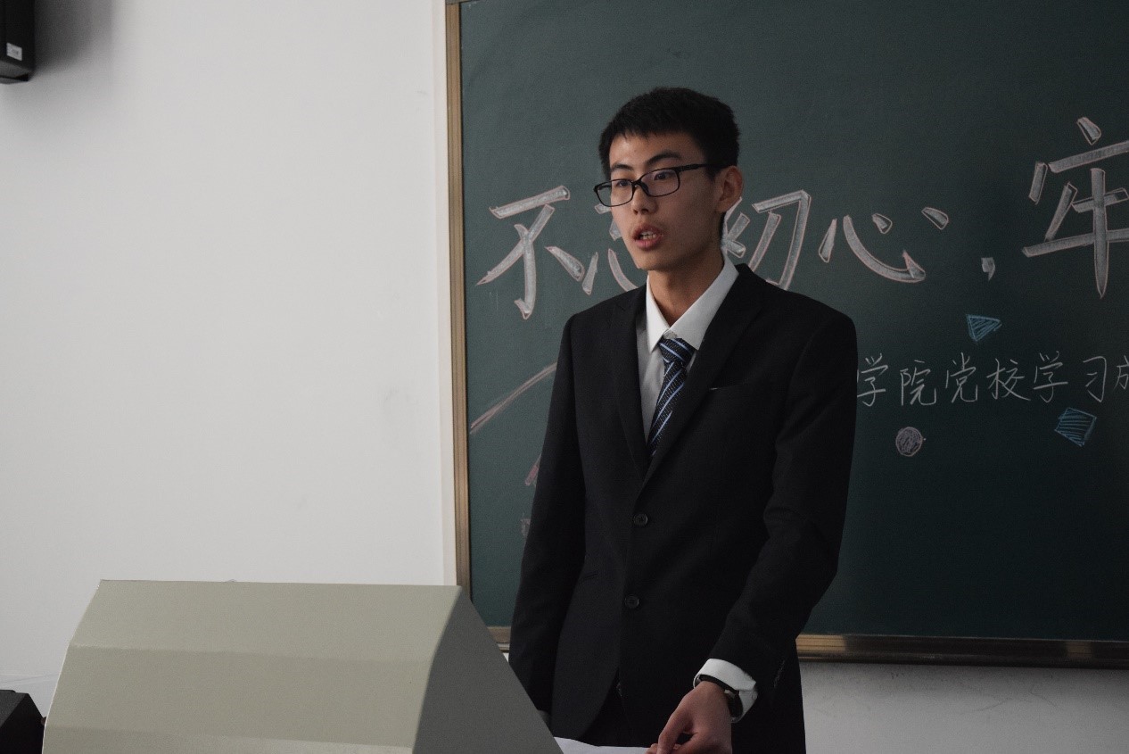 接下来,发展对象学员代表刘思远同学上台发言。刘思远同学通过“电车选择问题”引发大家思考,赞扬战争年代的党员献出生命保卫家园的无私奉献精神。如今我们在和平时代幸福生活,这来自于祖国的强大和那些替我们负重前行的人的奉献。刘思远同学说,我们在享受美好环境的同时,要思考自己能否担起责任,为中国人民谋幸福、为中华民族谋复兴。这注定不是安逸的道路,面对无数困难,我们应当有理想、有本领、有担当。最后,刘思远向大家表明自己贡献祖国的决心并号召大家共同为祖国发展贡献自己的力量。