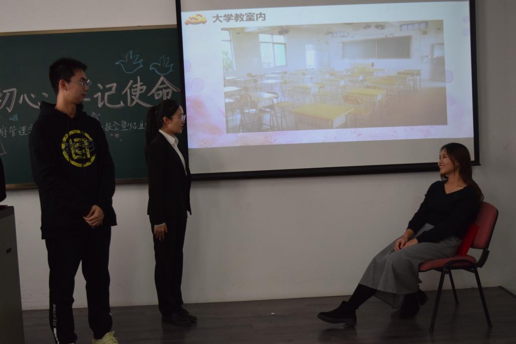 第二小组成员从青年学子的治学初心切入,展开微型辩论、案例分析、志愿服务等活动,在实践中探索学习主题,从历史使命支援及现实坚实力量两个角度挖掘青年的治学初心。通过学习,第二小组指出,青年人应“推开自身的那扇门,走上社会,心怀国家”,加强理论学习与专业知识学习,锻炼创新思维,达到学有所用、建设国家的目的。现场展示环节,小组成员表演了心系村中百姓,实地走访村民的焦裕禄书记,以及大学时便立志回乡支教的黄文秀同志,他们一心为民的奉献精神使在场的同学们备受鼓舞。充实的展示内容,精彩的人物展现给老师和同学们留下了深刻印象。