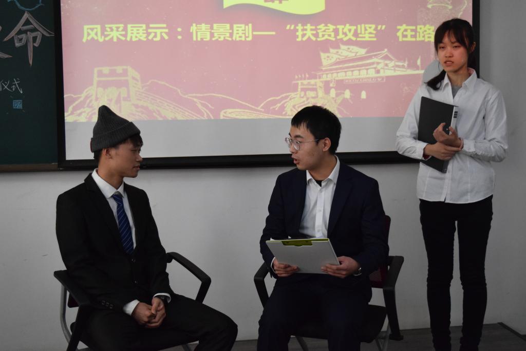 在完成党校线上线下学习任务的同时,第五组成员通过线上讨论学习会、参观展览馆,了解脱贫攻坚的理论发展及实践路程,并通过线上采访四川省广元市金华村第一书记,知晓脱贫攻坚战的实际情况。随后,小组组员们分别饰演广元村第一书记路小康、广元村村民牛大发等角色,生动地展示了脱贫攻坚政策推行过程中遇到的问题及问题解决后广元村呈现的繁荣景象。同学们风趣的方言、极富舞台张力的表演得到老师和同学的好评。