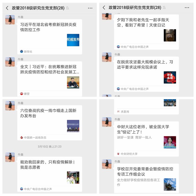 牛鑫同志:作为一名党员,面对疫情,首先积极响应国家号召,不串门、不聚会,戴口罩、勤洗手,主动向亲朋好友普及疫情实况,呼吁大家自觉居家隔离,及时传达党和国家的最新政策和指示。看着前线的动人故事,我也想为抗疫贡献一份力量,在此期间,参与了北京莲心慈善基金会组织的线上志愿活动,与一线的医院对接需要的物资信息,采集物资接收反馈,前线医生的朋友圈时常诉说着把病人从死神手中抢回来的喜悦,时常牵挂着仍在疫区受苦的病人,无不感动和鼓舞着我。我坚信,伟大的中华民族必将迎来抗疫胜利;我坚信,人民有信仰,国家有力量,民族有希望。