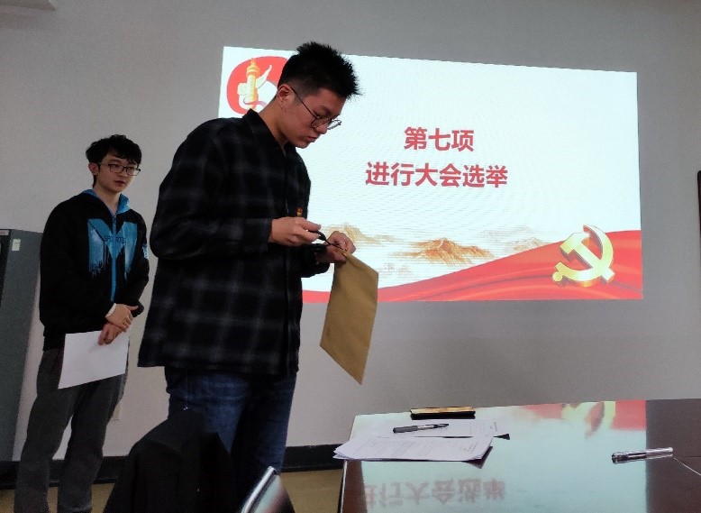 由总监票人张栋同志主持选举beat365vip官网登录入口本科生党支部新一届委员会委员。本次选举发放选票8张,有效选票8张,李莎莉同志获赞成票7票,陈建军同志获赞成票7票,严其姝同志获赞成票4票,王文昊同志获赞成票6票。大会选举李莎莉、陈建军、王文昊三位同志为支部委员,选举结果有效。