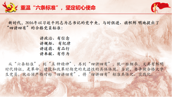 最后,吕丽书记对标“四讲四有”精神下的不合格大学生党员具体表现,提出了新时代合格大学生党员的标准,并希望各位学员能够早日成长为有理想、有本领、有担当的新时代合格大学生党员。
