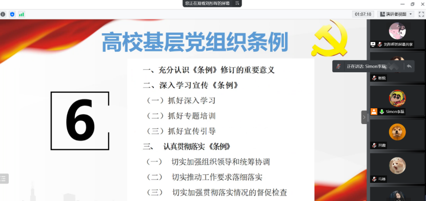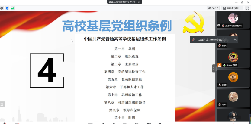 会议伊始,李磊同志传达了校党委关于认真学习贯彻《中国共产党普通高等学校基层组织工作条例》的通知,并带领大家了解了《条例》修订的过程背景、指导思想和修订原则,随后重点学习了《条例》有关高校党的建设工作应当遵循的原则,推动党的创新理论进教材进课堂进头脑,办好思想政治理论课,加强“四史”教育等规定精神。