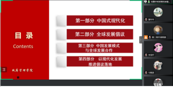 随后,张鹏老师从中国式现代化、全球发展倡议、中国发展模式与全球发展合作、以现代化发展推进倡议落地等四个方面对如何深入推进中国式现代化进行了全面的论述。