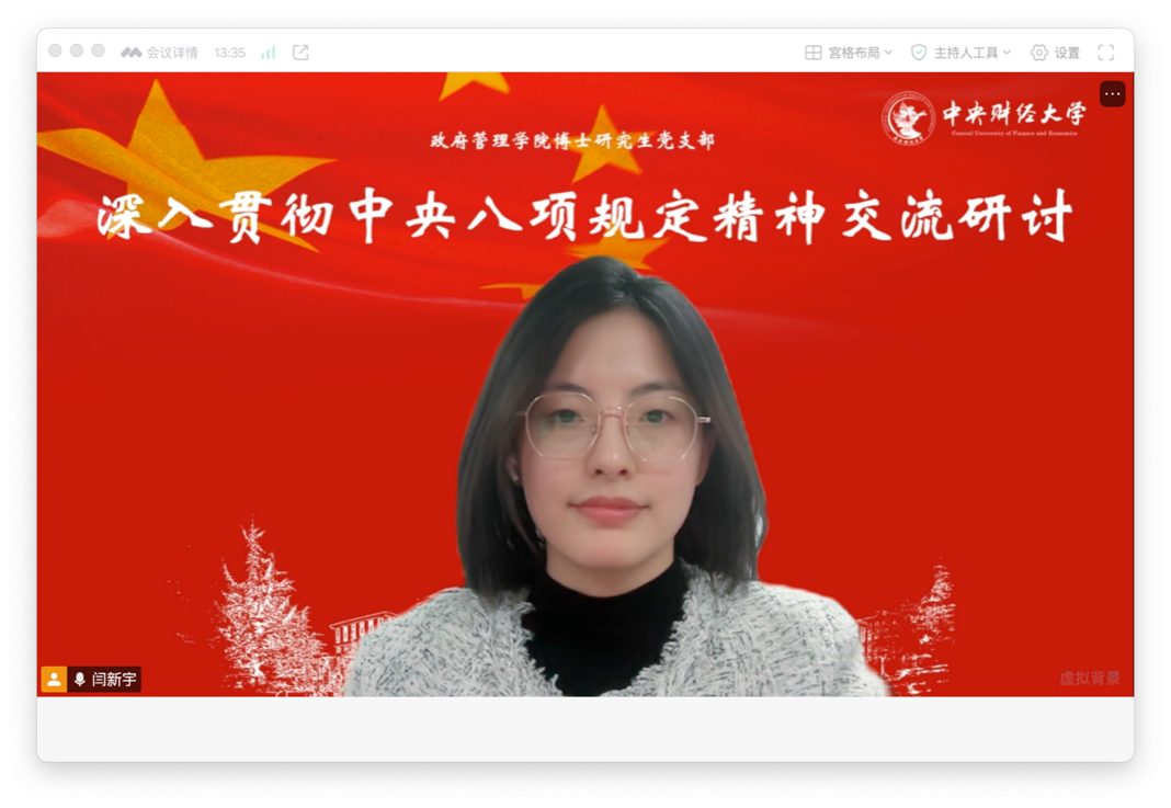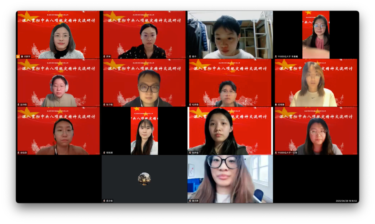 2025年4月28日,beat365vip官网登录入口博士研究生党支部通过线上会议形式召开“第一议题”学习暨深入贯彻中央八项规定精神学习教育专题研讨会。会议集中开展“第一议题”理论学习,深度研析中央八项规定精神内涵,通过案例警示与交流研讨强化教育实效。会议由党支部书记闫新宇主持,支部全体党员参会。
