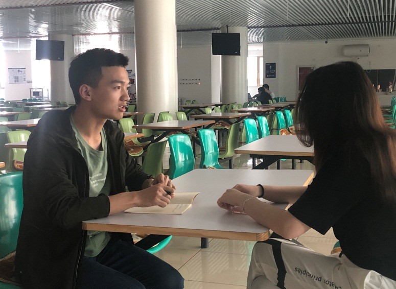 图为行管党小组组长田飞和刘颖谈心