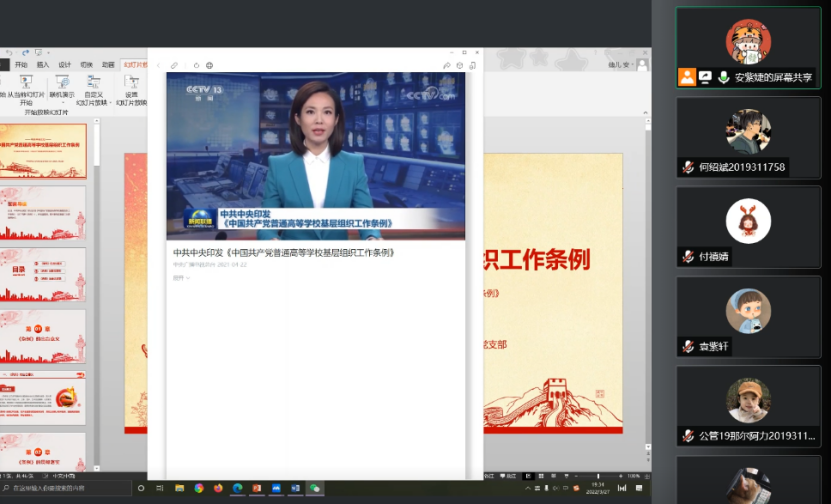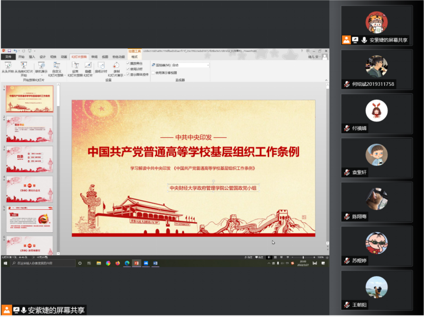 2022年3月27日晚,beat365vip官网登录入口本科生党支部公管国政小组通过腾讯会议的方式,在线上开展关于《中国共产党普通高等学校基层组织工作条例》(以下简称《条例》)专题学习会议,会议由安紫婕同志主持。