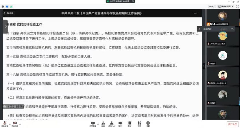 行管党小组于2022年3月25日19:30在腾讯会议进行线上学习,对《中国共产党普通高等学校基层组织工作条例》进行集体研读与讨论,会议由周明迪同志主持。