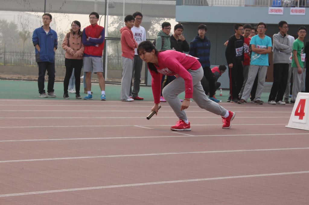 下午的阳光若隐若现,广播里播放着轻快的乐曲,运动场上洋溢着青春的气息。运动员们来到了起跑线上,拉拉队员们也各自就位,比赛马上就要开始了。首先进行的是女子组的比赛。裁判员举起发令枪,第一棒的同学屏住呼吸,专注地等待枪声响起。“啪”的一声枪响,作为第一棒的王瑛就冲了出去,加油声呐喊声回荡在整个运动场上。最后100米,咬咬牙,再次加速向下一棒的同学冲去,准确无误地交棒。第二棒的巩一帆接过接力棒的同时向前加速,奋力跑了出去。同学们的目光紧紧胶着在她的身上,近了、近了,再次准确的交棒,张阿曼迈开脚步向前一名同学追了上去。最牵动人心的时候到了,接力棒交到了罗鑫玥手中,她似流星赶月一般跑了出去,场上的呐喊尖叫此起彼伏,似乎拉拉队员们希望将自己力量加在运动员身上。当最后一棒冲向终点的时候,队员们都开心地拥抱在了一起。