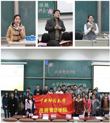 在两位老师的介绍之后,冯燕,林诗雨和谭翠萍分别就自己的认识并结合经验向在座的各位同学进行了更为针对性的宣讲。冯燕的关注点在于团队组建,课题选择,导师沟通,资料搜集四个方面,林诗雨则从前期中期后期三个时间段的相关事宜进行了详细的介绍,谭翠萍的宣讲着重于挑战杯论文的撰写问题,涉及了前期准备,正文撰写,小小建议以及与实践课题的区别说明。