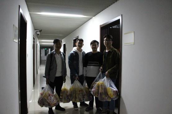 第二站是15号楼,在宿管阿姨登记后,两位老师就直奔政管男生宿舍。敲响宿舍门,走出来的同学迷茫地看着老师,直到收下零食才弄明白老师的来意。惊喜之余是满满的感动;有帮助他人的满足,还有收获关心的快乐。