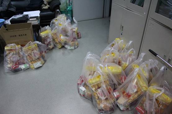 晚上七点半,宁老师和杨崇祺将各类零食分别装入准备好的袋子中,包括小面包、小饼干等,二十五个袋子分堆地摆放在办公室中,代表了学院对献血同学们的鼓励赞扬和关心爱护。八点半,宁老师、阙老师与杨崇祺学长分别提起装满慰问品的袋子,往学生宿舍楼走去。