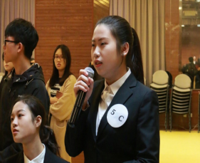 观众的欢歌笑语将比赛推向了尾声,最后一个环节是即兴演讲。每组依次选择一道演讲主题,并在短暂准备后,派出一名代表进行2分钟的即兴演讲。本环节不仅考验了选手们的应变能力与思维深度,同时还考察了演讲者的礼仪展现,他们在台上的姿态,最直接地体现出他们是已将所掌握的礼仪知识付诸实践,还是只是“纸上谈兵”。
