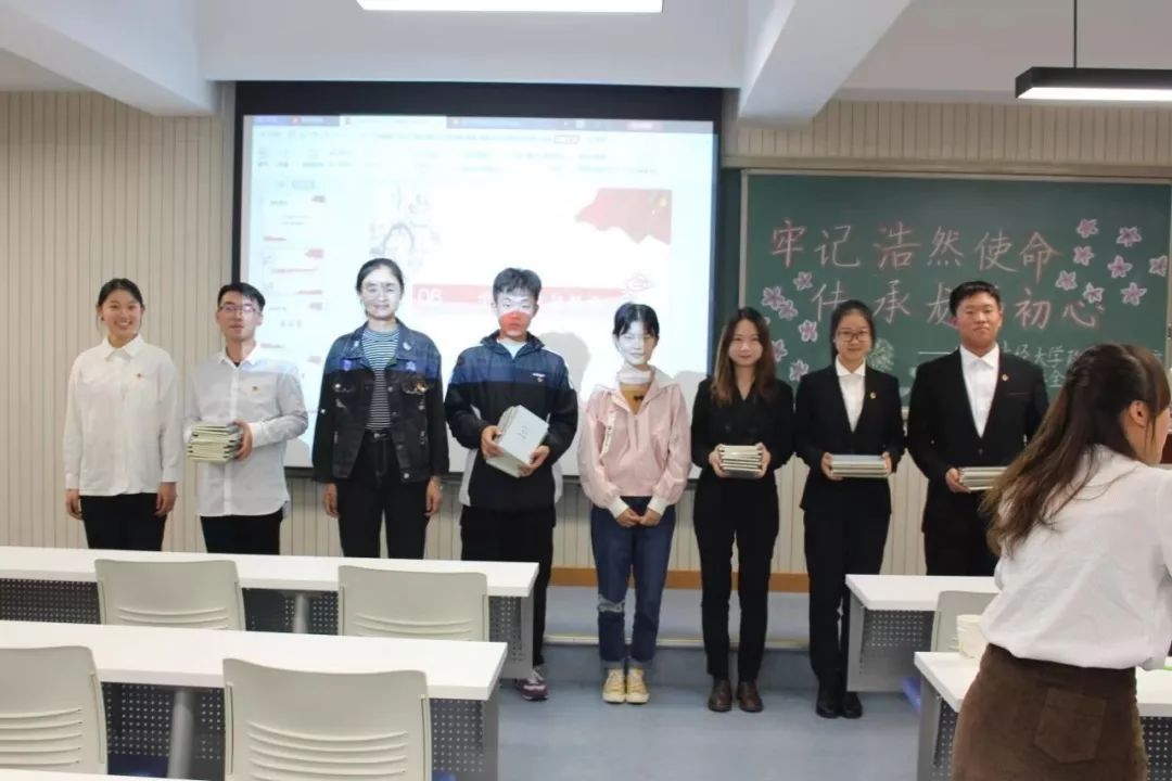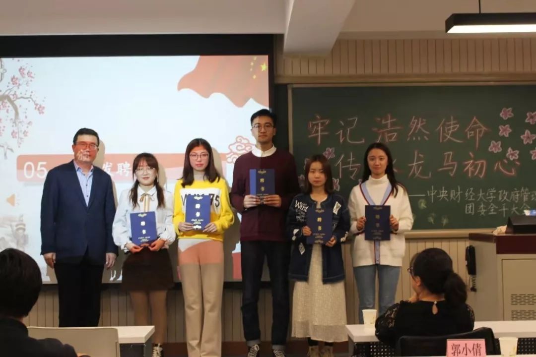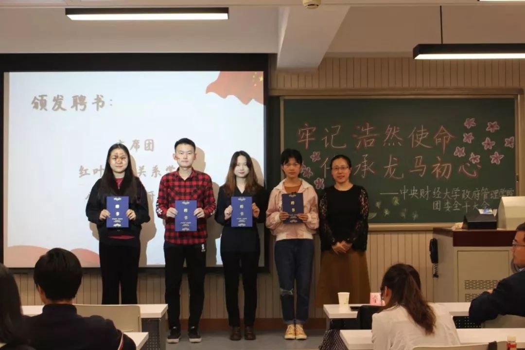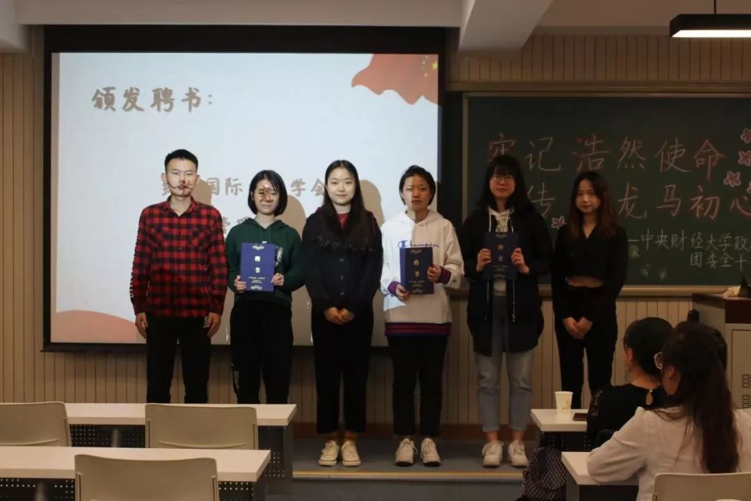 随后,刘家琦老师宣读学生会任职名单,党委副书记白云真副教授、团委书记李莎莉老师、主席团以及社团负责人分别为主席团成员、社团负责人以及各部门部长颁发了聘书。伴着激昂的乐声,团委学生会上任部长代表们与新任部长们交接部旗,各部门部长为新干事佩戴团徽。