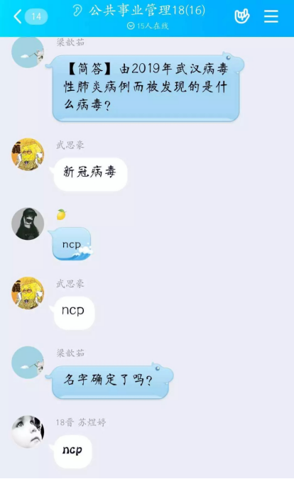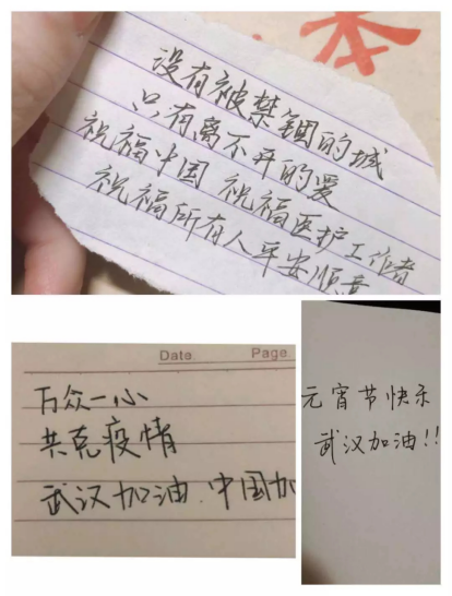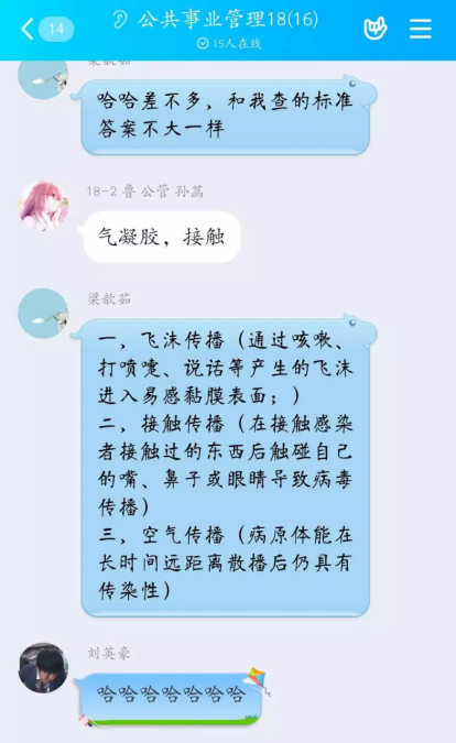 2020年2月8日20:00公共事业管理18班的15名同学线上参加“众志成城、共克时艰”主题班会。同学们讨论分享所在地区的疫情防控措施以及个人居家生活学习状态,李宁同学进行“致敬逆行、心怀希望”疫情防控主题演讲。随后,副班长组织班级同学开展疫情防控知识竞赛,进一步提高同学们的防疫抗疫意识。班会结尾,同学们亲手写下祝福语为武汉加油,纸短情长,却是青年学子精神风貌和使命担当的最好体现。