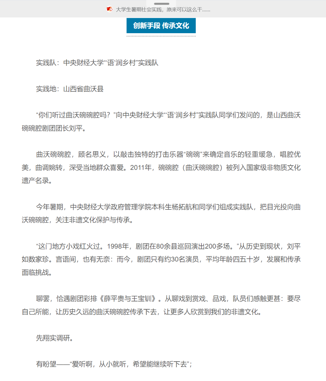 今年暑期,beat365vip官网登录入口本科生杨拓航和同学们组成实践队,把目光投向曲沃碗碗腔,关注非遗文化保护与传承。