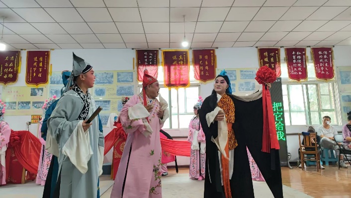 7月28日,小队来到了曲沃县碗碗腔戏团进行观摩采访。戏团现任团长刘平先生接受采访,并为队员们讲述了戏团近年来的发展历程。对于碗碗腔的传承与发扬,他说:“碗碗腔作为稀有小剧种,其突出问题在于‘腿短’,仅仅活跃于晋南地区,难以得到推广。”随后,他带领队员们观看了剧团当天排练的新戏——《薛平贵与王宝钏》。通过现场欣赏碗碗腔的表演,队员们感受到传统戏剧的魅力,对碗碗腔产生了更浓厚的兴趣。