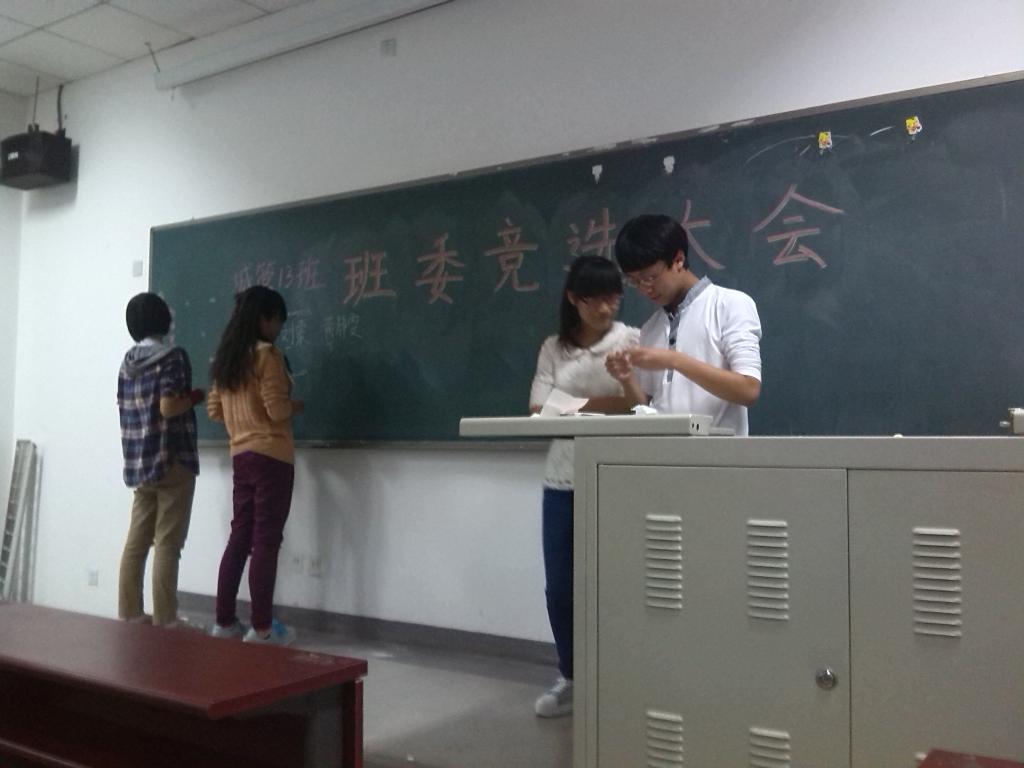 会议开始后,陈老师首先就班委选举规则做了简单介绍。随后,竞选正式开始,参加选举的同学纷纷积极而有序的上台,就所竞职位及未来工作展望等方面进行了精彩而生动的演讲。他们充满自信,幽默风趣的演讲赢得了台下同学们的阵阵掌声。接下来,同学们以无记名投票的方式为自己所支持的竞选者投出宝贵的一票。最终,在全班同学的见证下,由班长王瑛,团支书刘伟家,副班长李雨嘉,组织委员陈璐,宣传委员史瑞峥,学习委员吴端洁,安全委员王韶光,生活委员费继鹏、孙蓉,心理委员陈泽平、冯燕,文体委员陈绍飞、李露茜等同学组成的城管13班班委正式成立。