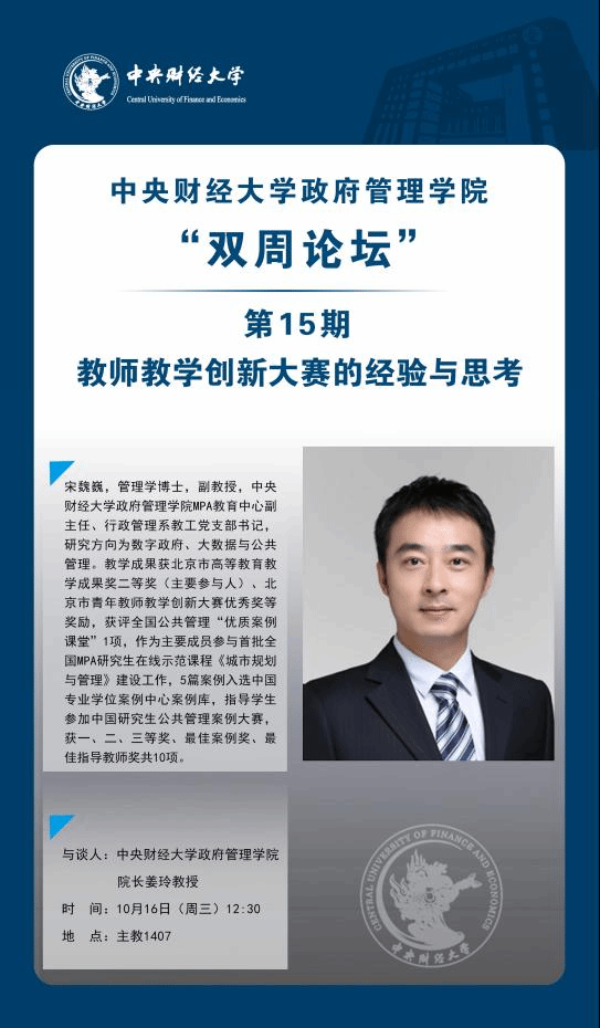 主讲人简介:宋魏巍,管理学博士,副教授,beat365vip官网登录入口MPA教育中心副主任、行政管理系教工党支部书记,研究方向为数字政府、大数据与公共管理。教学成果获北京市高等教育教学成果奖二等奖(主要参与人)、北京市青年教师教学创新大赛优秀奖等奖励,获评全国公共管理“优质案例课堂”1项,作为主要成员参与首批全国MPA研究生在线示范课程《城市规划与管理》建设工作,5篇案例入选中国专业学位案例中心案例库,指导学生参加中国研究生公共管理案例大赛,获一、二、三等奖、最佳案例奖、最佳指导教师奖共10项。